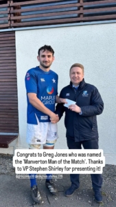 Then the kick ahead by Aaron O’Sullivan was just excruciatingly too long for his fast follow up. Aaron fully metamorphosed from Sevens to full metal rugby, today. Not only did his play led to a super try, but was hunting and hurtling all over the pitch, esurient and fervent. On a day of joy, there was so much to enjoy and love and many top-class performances. It was disappointing to allow in three tries from close in, but that said, UCD have a fine pack and an adventurous backline. The set pieces were fairly even. Our loose play was sharp and fast and forward play powerful and confident, with the pack’s back five constantly marauding, with Ronan and Josh in the van. This squad has a high alteration capacity without performance dip, having so many elite and emerging players within it. One of outstanding ability is undoubtedly Mensa Man, Greg Jones, who puts his cousin, Indiana in the shade. His leadership and direction are signal, and his strategic perception is baffling. His general play is constant and highly effective. Today his lineout work and loose and support play were excellent. At a critical juncture, when close to the UCD line he read the runes, so broke off hard, pirouetted, and fed Richie Bergin on an acute vector to score the neatest of tries. His overall effect on the game earned him the Manverton MoM Award. (See Photo of presentation by Vice President Stephen