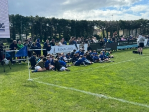 There had been 4,000 tickets sold, so the greatest crowd ever experienced by St. Mary’s College RFC for the most important home match the club has ever played was expected. Arriving today, a bright breezy one, it was akin to Mardi-Gras with a kaleidoscope of colours, mainly of the blue and white, and purple and black hues. Odours of coffee and burgers and tacos and pizzas assaulted nostrils. A swirling horde of zealots, singing and swinging, chatting and chanting, shuffling and zig-zagging, elbowing to coffee splashing and slopping, as they sought vantage points, 8s to 80s, tremulously hoping. It was worth observing the keepers of the gate (Gary Croke, Johns, Bainbridge and Stapleton et al.) patiently and efficiently checking all entrants. These members generously spend hours each AIL match in this valuable chore. The appeal for volunteers was heeded by many, and without them all would have been impossible. It is noteworthy that parents over the past number of seasons have not only supported their son’s team, but more. Peerless Ronan Watters’s dad, Brian Watters, has been to the fore. This week, he was working hard as a volunteer and was a steward today. The president expressed his profound gratitude and appreciation to all those who answered his call for volunteers, including the 25+ members who, during the week, deep-cleaned the club, tidied, power-washed, removed every scrap of rubbish and waste, and much more.