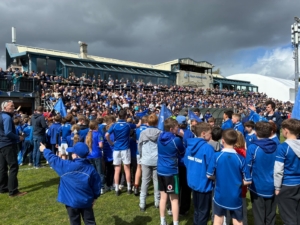 There were 200-250 of our cheering young mini players forming an avenue of blue and white waving flags and banners for the players coming on to the pitch, A tunnel of love. Behind them was the ubiquitous John Pyne and his St Mary’s Flag. Then the epic joust unfolded.