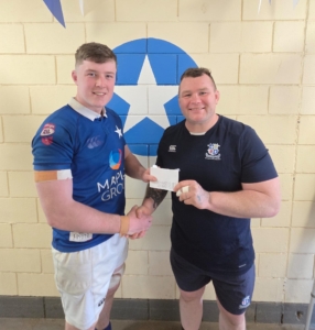 towards the Road End and with a slanted wind towards Carvill Corner. There was almost a gasping urgency in attack and defence as deadly Dan Goggin, who had a superb high-powered game, drove through the slightest slits in defence. Myles, back after an injury break, used his gliding vectors to test the defensive set-up. Having 23 man squads for the semis and final allowed Mark et al. to make judicious alterations during the match. For Mary’s having Greg Jones at his wizardous best gave an edge, especially in set pieces and spinoffs. During the game, there were periods when both teams faced fierce attacks where they needed contumacious determination in defence, with white sparky flashes from clashes. It was evident that every athlete on the field gave of his very existence to try to swing the game in his team’s direction. The intensity of action was breathtaking. There were many distinguished performances and so it was close to call for the Manverton MoM Award. Daniel Leane’s game has grown in every facet, with his mentor and partner, Greg Jones, beside him, and has reached a high zenith. Once again his lineout work was soaring as he and colleagues spoiled the opposition ball or took it cleanly. His oft unseen, close-in work is particularly noteworthy and productive and his carrying is clever and effective; his defence is highly reliable and destructive. His work rate today was esurient. He received the Manverton MoM Award. (see photo of Jack McGrath presenting the Manverton MoM Award to Daniel).